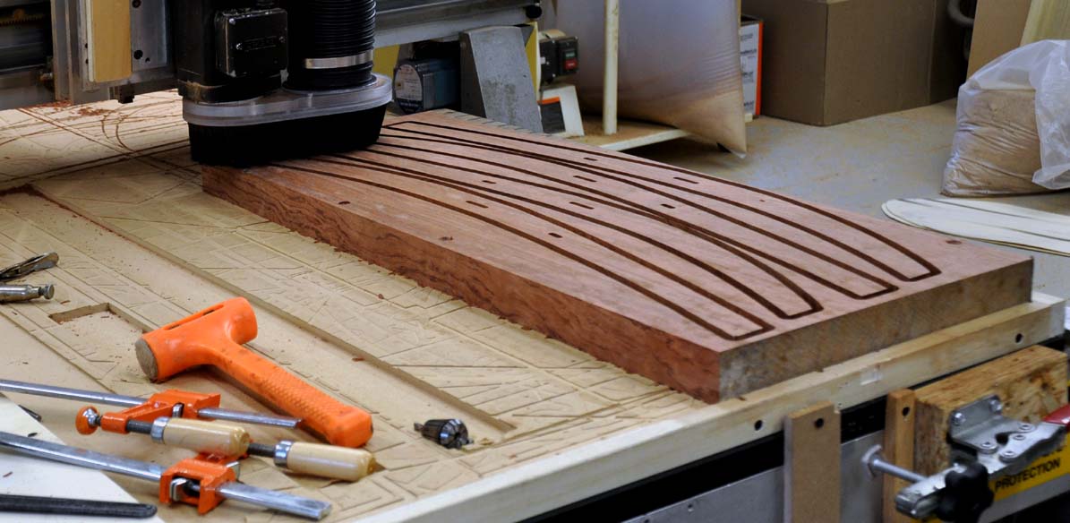 and now he's well on his way to 8 more, only in bubinga. hard heavy stuff, but no match for trevor and his cnc work