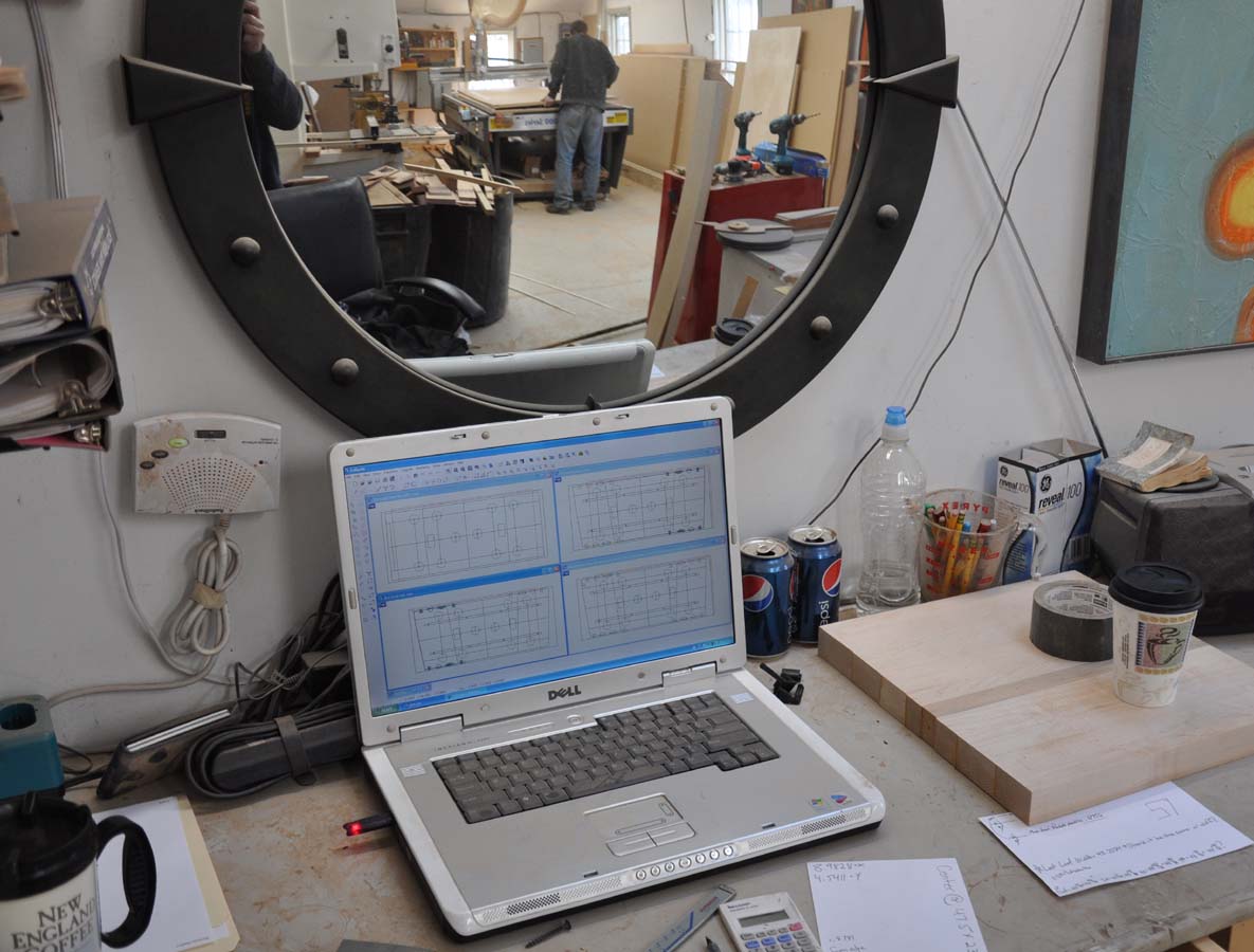 Steve Holman in the center (it's actually his project and we're just the 'helpers'), his assistant Kevin is on the left above, and Trevor, my cnc guy, is on the right. Trevor has done an amazing job figuring out how to cut all this stuff, including the solid wood edges, bolt holes, holes for the electricals, and the granite patterns on our (second floor) cnc. It's been a lot of hauling....