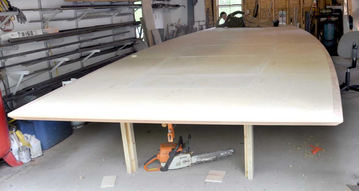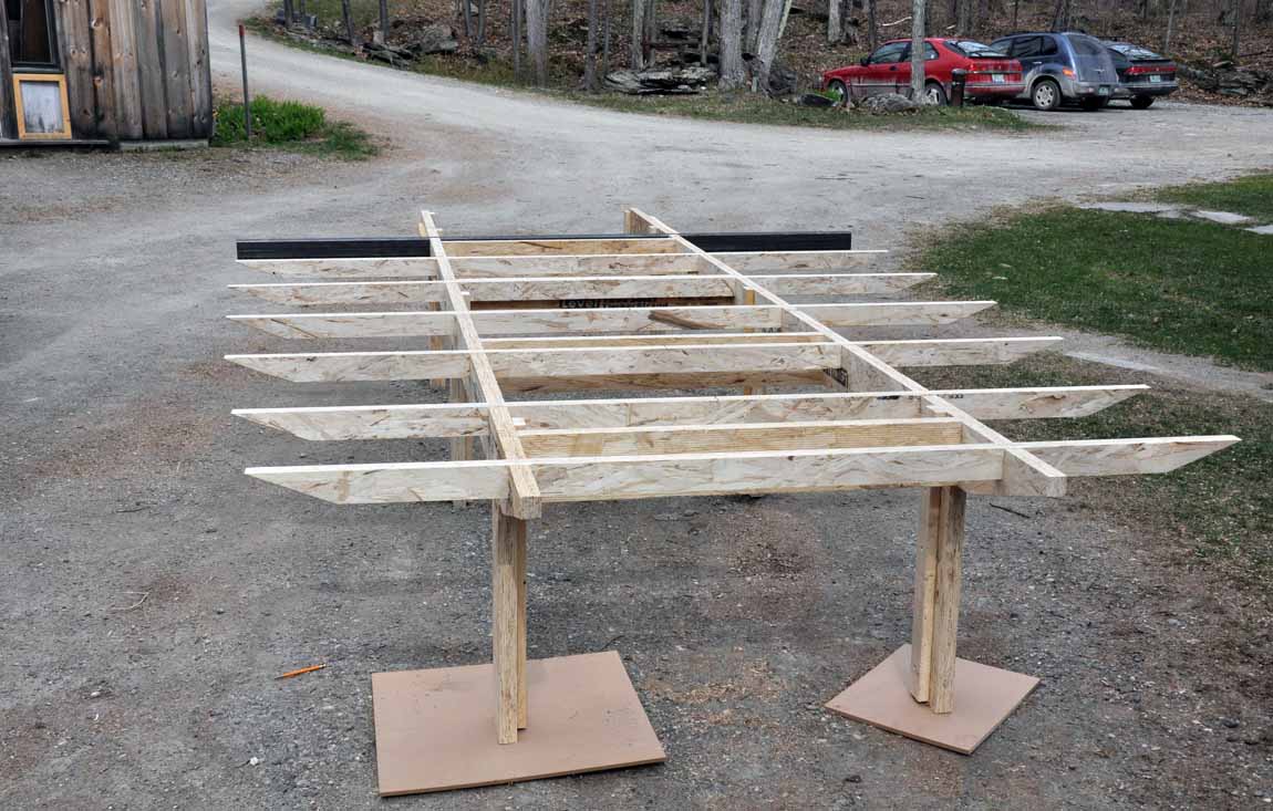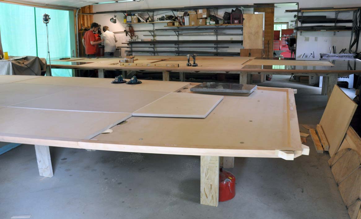 We've had to move most of the work now to my 28'x 30' garage, where they just barely fit side by side ... In the foreground is the working base, made from Timberstrand, which allows us to work on both the bases and the tops in our separate shops ...