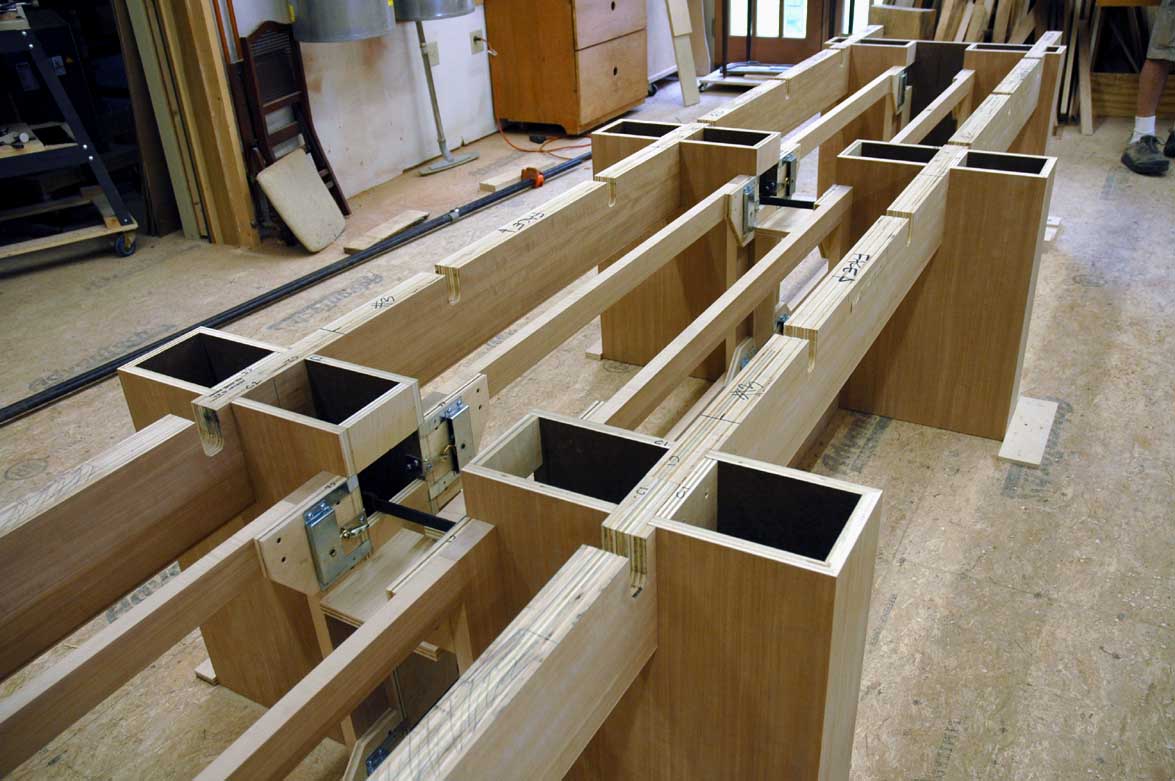 In Steve's shop, we were able to assemble the sections temporarily on their permanent base to be sure that once the table is finished and assembled on site, everything will fit together smoothly.