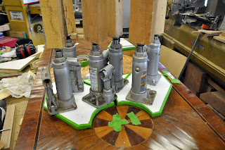 as i got to the middle of the top, i had to switch to my original, from the 80s, hydraulic jack clamping concept. i've got about 10 of them from when before vacuum veneer bags were readily available and affordable. i even had the sticks, and the blocks were still on the ceiling