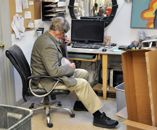 seemed simple at first. all we had to do was build it in the shop and move it into the gallery 10 miles away. we started with the short end above, two pieces of ultralight mdf with two pieces of ultra light 1/2" sheetrock .. at 4' x 7', it turned out to be anything but 'ultralight', and we realized a wall 8' x 7'