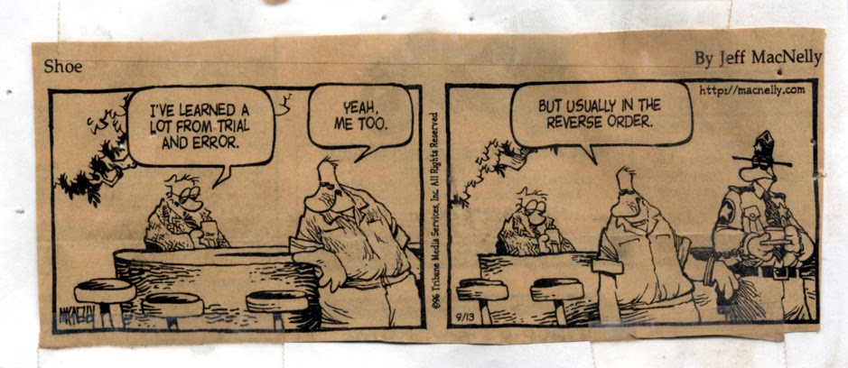 Ahhhhhhh.... I always think of the New Year as kind of a blank slate .... I know it's just another day/week/year coming up, but I like to think I can start anew and correct little things in my personality that irk me. Hasn't happened in the past; probably won't happen this year either. I did, actually, even though everyone else had a paid holiday, spend some time today organizing my office and getting my job list on my whiteboard, but, why is my bench always such a mess .... Where is that thing I had in my hand not TWO seconds ago? Why oh why do I hate Quickbooks Pro 2010 sooooo much? Why don't I have a proper tool cabinet of my own after 35 years of doing this when everyone else in the shop is so orderly? This is starting to look like a list of new year's resolutions and maybe it is ... We'll see ... My wife Kit is finally getting a real bureau as we speak, after about 5 years of me talking about it, so there is hope, maybe .... I leave you to ponder the above with me and also you can ponder the stuff below I scraped off my bulletin board recently ... Enjoy ... Don't go too deep with it ... It's light stuff ... Click the images to enlarge them ....
