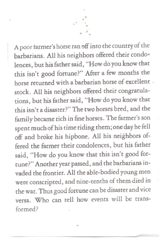 'Who can tell how events will be transformed?' Indeed ... I love this story .. It's from the reference section of the Steven Mitchell translation of the tao te ching. It also, along with the one below, has the most thumbtack holes in it and I now can retell it almost verbatim ...
